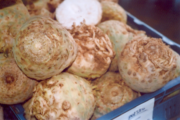 Celer očistíme a uvaříme ho asi do poloměkka v osolené vodě. Necháme okapat a nakrájíme na tenké plátky. Uzené maso umeleme, a smícháme s jedním vejcem a hořčicí. Směsí potřeme celerové plátky, které stočíme a rolky poskládáme na pekáček s rozpuštěným máslem. Celé potřeme rozšlehaným vejcem a podlijeme vývarem. Pečeme zhruba 20 minut. Podáváme s opečeným bramborem.