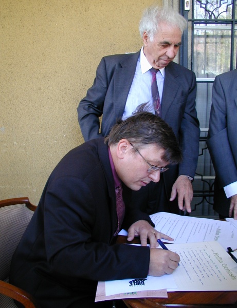 "Jsem snílek, ale někdy se mé sny stávají skutečností. Na konci milénia jsem měl nápad vyhlásit soutěž 'Děti světa ilustrují Bibli'. S tímto projektem jsme šli do 91 zemí celého světa a dostali jsme skoro 800 000 kreseb. V prosinci roku 1999, během posledního týdne milénia, devadesát dětí ve věku od 6 do 16 let se svými rodiči přišlo do rezidence izraelského prezidenta Weizmana a obdrželo první cenu za každou zemi. Potom jsme byli požádáni, abychom s biblickým projektem pokračovali, ale nevěděli jsme jak, když jsme právě skončili. A potom jsme přišli na myšlenku vyhlásit nový projekt pro milovníky Bible na celém světě, a tak vznikl projekt 'Národy světa píší Bibli'. Věděli jsme, že Bible byla přeložena do 2035 jazyků a dialektů (pro srovnání Harry Potter byl přeložen do devadesáti jazyků). Na celém světě budou lidé ručně psát Bibli, verš po verši, v mnoha jazycích. Ve Starém zákoně je 20137 veršů, v Novém zákoně je 9500 veršů, takže v každé zemi lidé napíší všech 30000 veršů."