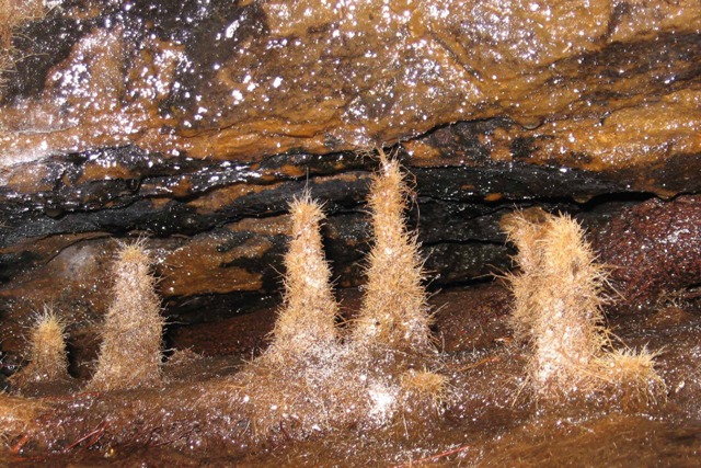 V kapičkách vody jsou rozpuštěny drobné částečky písku, takže vznikají útvary, které jsou velmi podobné krápníkům klasickým.