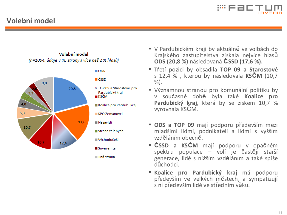 Do zastupitelstva Pardubického kraje by se dostala ještě TOP 09 a Starostové s více než 12 procenty, a dále KSČM a Koalice pro Pardubický kraj, kterým průzkum přisoudil shodně necelých 11 procent.