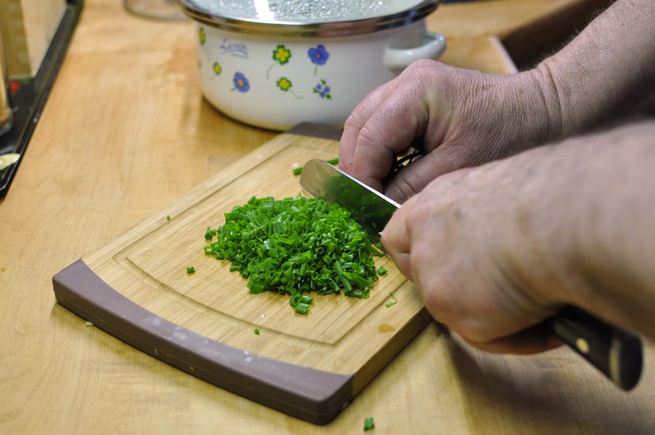 - Cibulku nakrájíme na kousky, pažitku nadrobno.