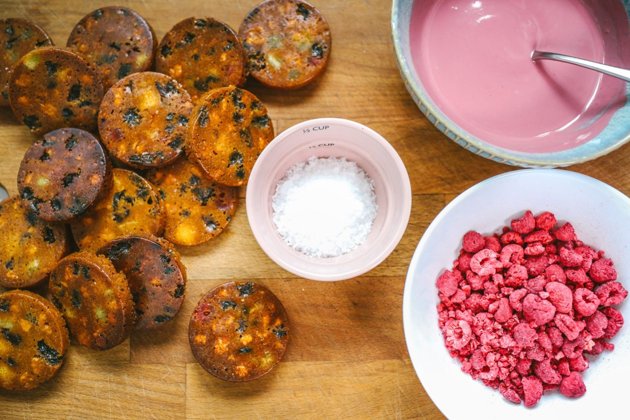 Mezitím si rozpustíme oblíbenou čokoládu a nadrtíme mrazem sušené maliny, kterými marokánky finálně dozdobíme. (Pozn.: My jsme použili ovocnou čokoládu, která je vyráběná z malin, je dochucena damašskou růží a tonkou.)