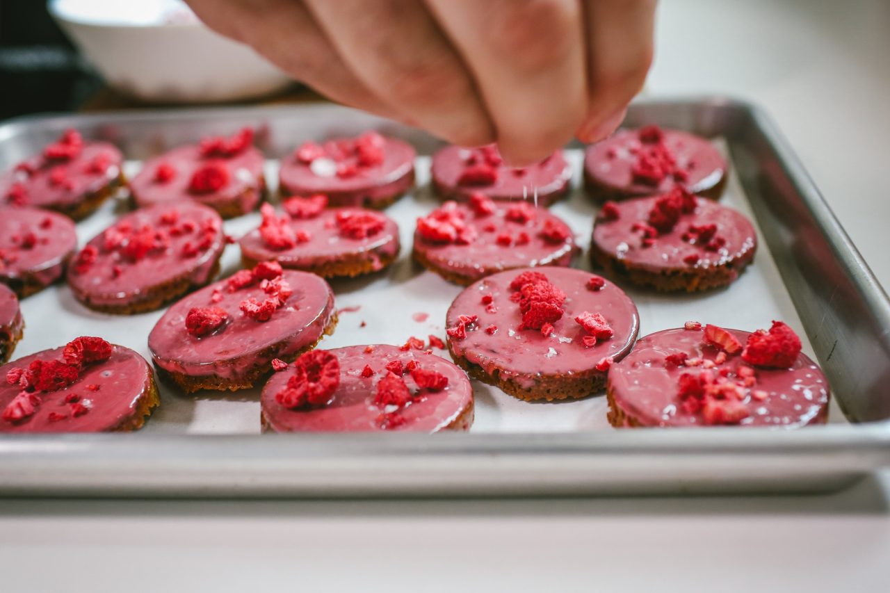 Marokánky omočíme čokoládou z hladké strany – ze strany, která ležela na dně formičky. Uchopíme ji prsty, smočíme do roztavené čokolády, posypeme drcenými malinami a šupinkami soli.