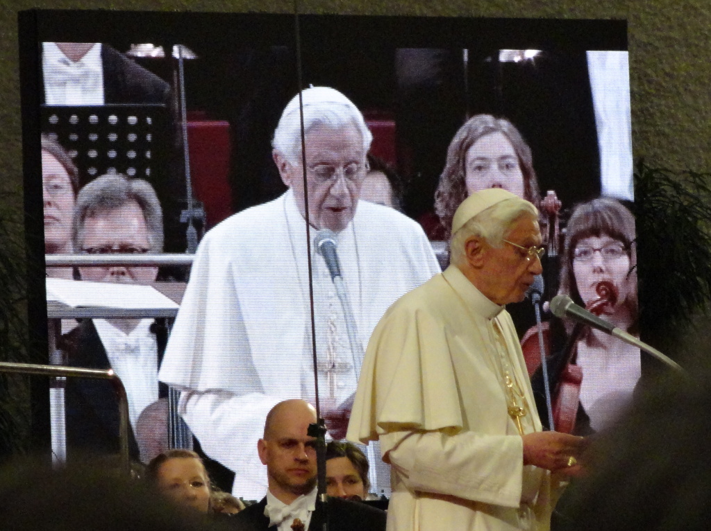 Zita Senková: „Nádherné. Byl to krásný a nevšední zážitek a myslím si, že ty dojmy doznívají ve všech, kteří jsme včera večer měli možnost být v sále na Svatopetrském náměstí ve Vatikánu. Odhadem přišlo asi šest tisíc lidí, jen pár míst jsem zahlédla prázdných. Atmosféra byla velmi slavnostní, ale velmi přátelská a místy, bych dokonce řekla, až jistým způsobem uvolněná. Papeže při příchodu přivítal potlesk publika ve stoje i zvolání ‘Tanti auguri (všechno nejlepší) Papa‘, cvakaly spouště fotoaparátů a mnozí – protokol sem, protokol tam – si dokonce zuli boty a stoupli si na židli, aby na Svatého otce lépe viděli. Doprovodil jej bratr Georg Ratzinger a po levé ruce měl čest sedět Stanislaw Tillich, premiér Saska, odkud pocházel hudební dárek oslavenci – lipský orchestr. Ze Svobodného státu Sasko přijela i početná delegace, takže saské vlajky jste mohli zahlédnout v ulicích Říma. Nicméně obálka bulletinu toho koncertu byla v barvách bavorského rodiště papeže – tedy modrobílá.“