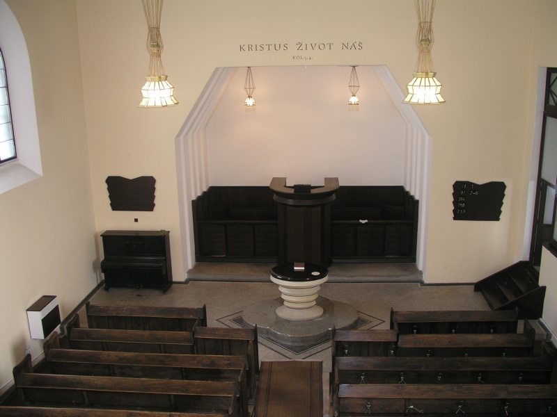 Nejkrásnější pohled do interiéru kostela se nabízí z kruchty, kde jsou varhany. Odtud můžeme vidět okna, která jsou zdobena jednoduchými vitrážemi s geometrickými motivy kosočtverců. Také strop je jednoduchý, se sítí čtvercových polí. Dominantou stropu a celého interiéru jsou jedinečné lustry. Dole jsou dva bloky dubových lavic, v nichž na pravé straně seděli muži, což lze soudit podle toho, že se v nich zachovaly původní věšáky na klobouky a deštníky; v kratších lavicích sedělo staršovstvo (představení sboru), protože tyto lavice byly nejblíže od kněžiště. Kněžiště je jednoduché a v něm stojí kazatelna, která má vyklenuté řečniště směrem do lodi. Pak je tam nádherný stůl Páně, který popisuje Dr. Miloslav Vlk takto: