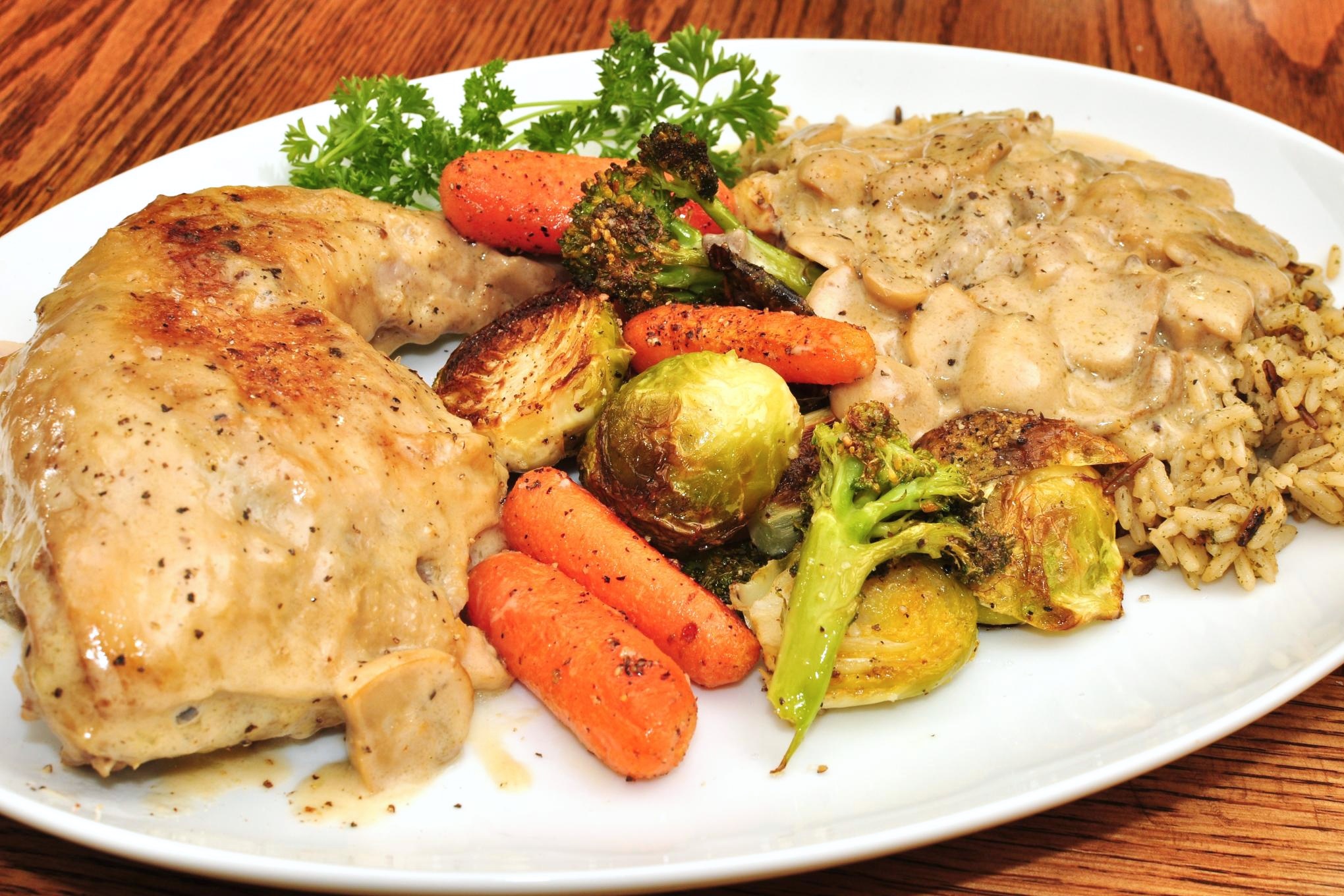 Kuřecí čtvrtky omyjeme a osušíme papírovou utěrkou. Poté je osolíme, okořeníme směsí koření a na másle rychle ze všech stran opečeme. Opečené kuře i s výpekem vložíme do vyhřáté trouby a pečeme za občasného polévání smetanou, do které jsme rozmíchali strouhanku. Před koncem pečení přilijeme víno a dopečeme.