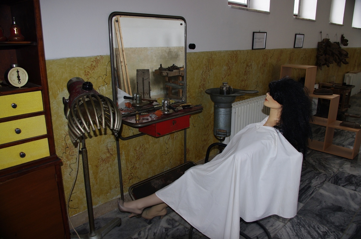 Nejvybavenější částí expozice je pochopitelně dámské kadeřnictví. Kromě mnoha propriet na úpravu vlasů – například kulem, které se nahřívaly ve speciálních píckách, si návštěvníci mohou prohlédnout třeba i unikátní chránič obličeje, který dámy používaly, aby se jim při úpravě účesů nedostal do očí lak na vlasy či parfém.