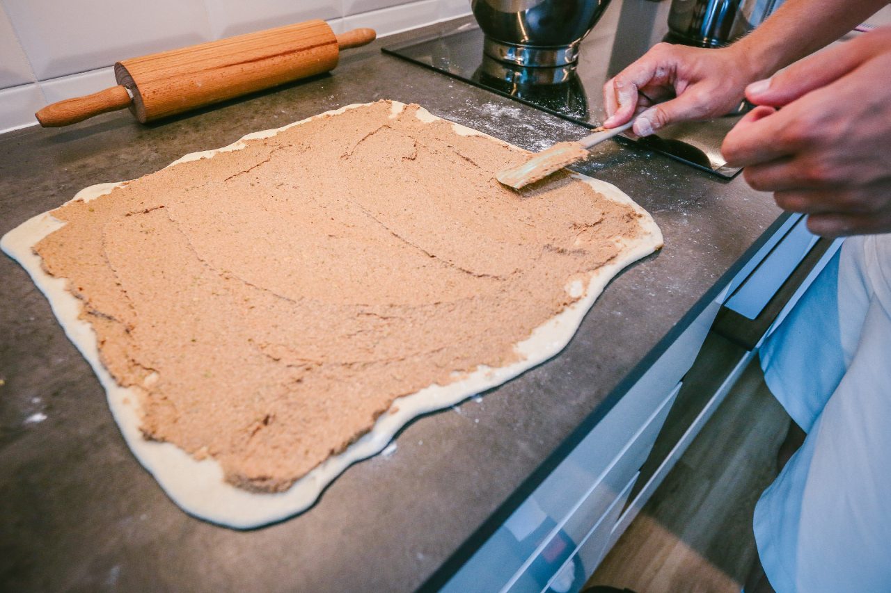 Necháme těsto odpočívat ještě pět minut, tím pádem nebude mít tendenci se stahovat zpátky. Potom placku potřeme pistáciovo-skořicovou pastou a těsto přeložíme na třetiny, jako bychom skládali list papíru do dlouhé dopisní obálky.