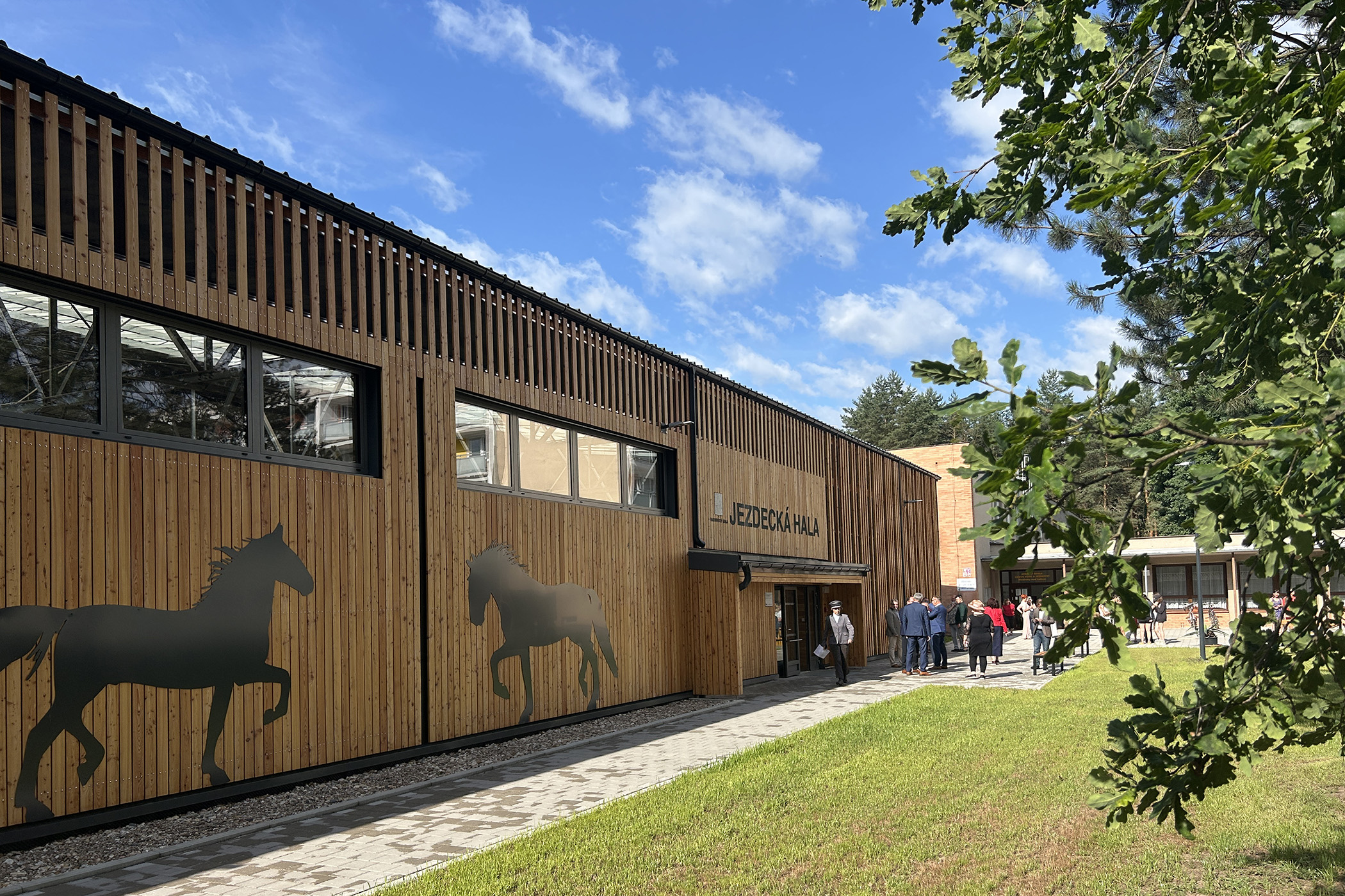 Fasádu tvoří moderní kombinace plechu v antracitové barvě a modřínového dřeva, zdobí ji i velké siluety koní. Podle náměstka hejtmana Romana Línka (Koalice pro Pardubický) už teď nic nebrání tomu, aby stará školní jízdárna mohla zmizet z areálu národního hřebčína.