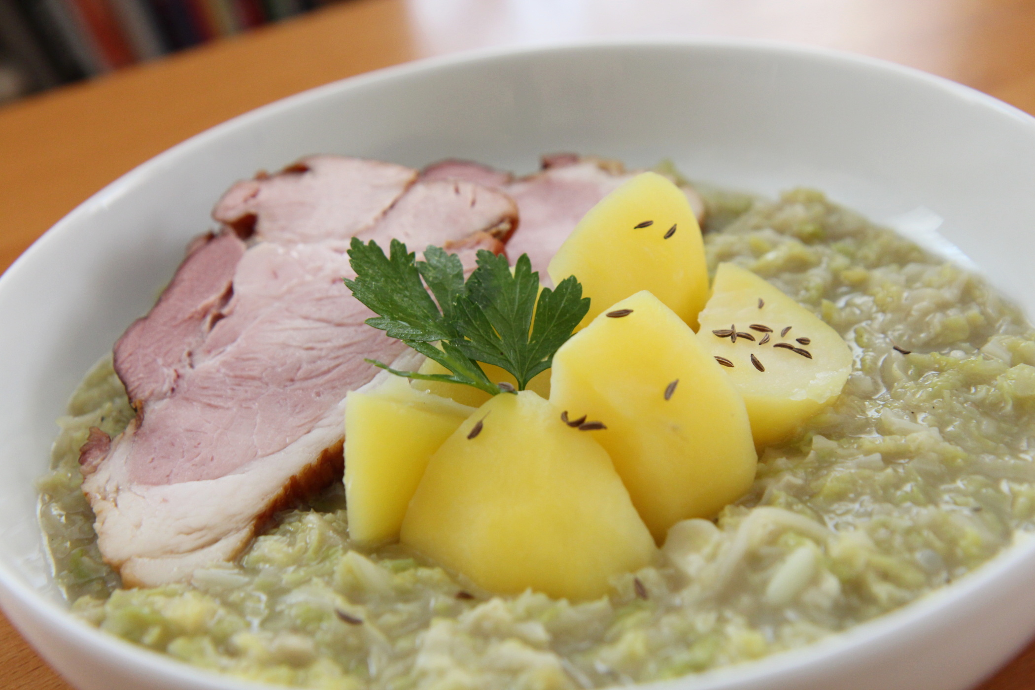 Kapustu nejprve uvaříme doměkka a prochladlou nakrájíme na drobné nudličky. Na másle zpěníme cibuli. Jakmile zrůžoví, přidáme mouku a připravíme nepříliš tmavou cibulovou jíšku, kterou za stálého míchání zalijeme studeným vývarem. Přidáme prolisovaný česnek, osolíme, opepříme, vložíme kapustu a ještě chvíli povaříme. Podáváme s vařeným hovězím nebo uzeným masem.