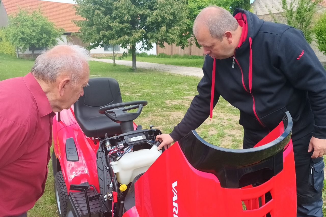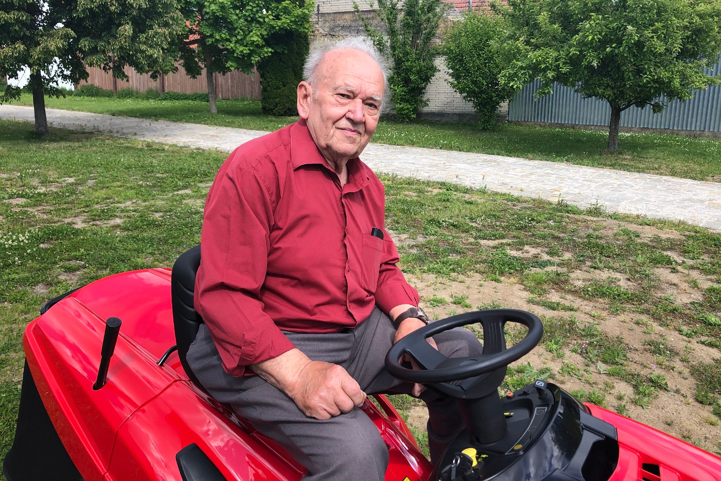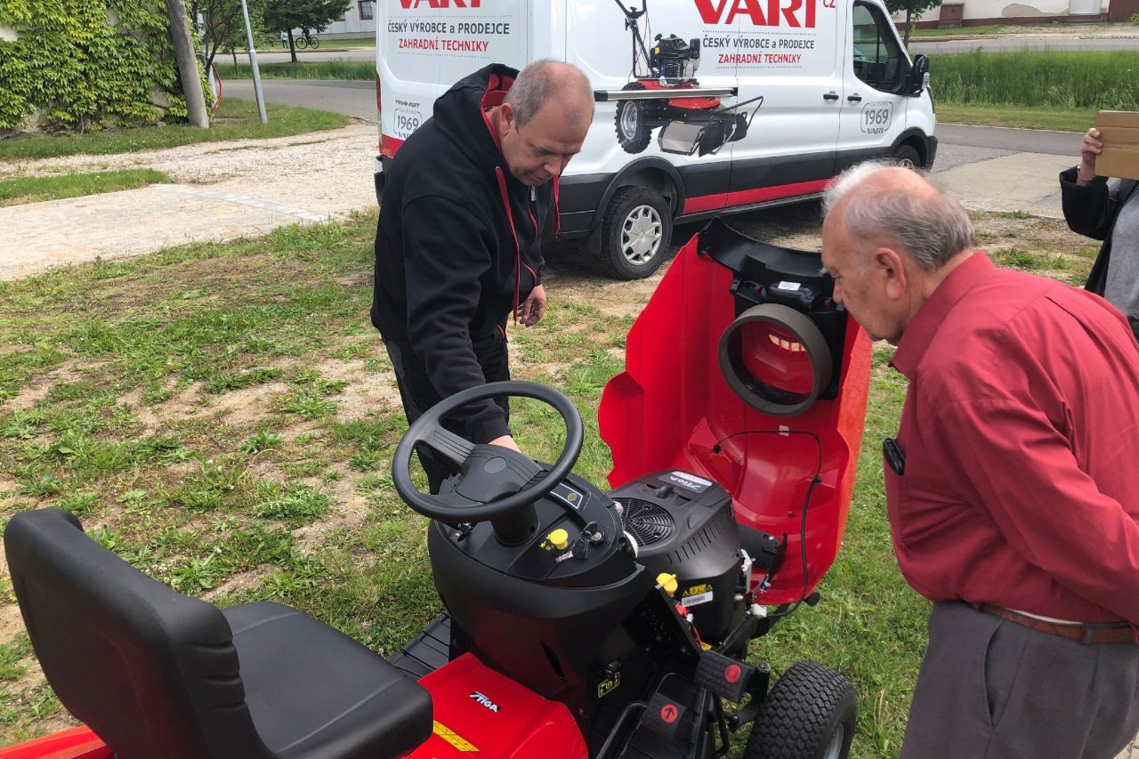 Zahradní traktůrek už je doma. Nový majitel spokojeně ocenil zvuk motoru a jízdou pověřil i vnuka