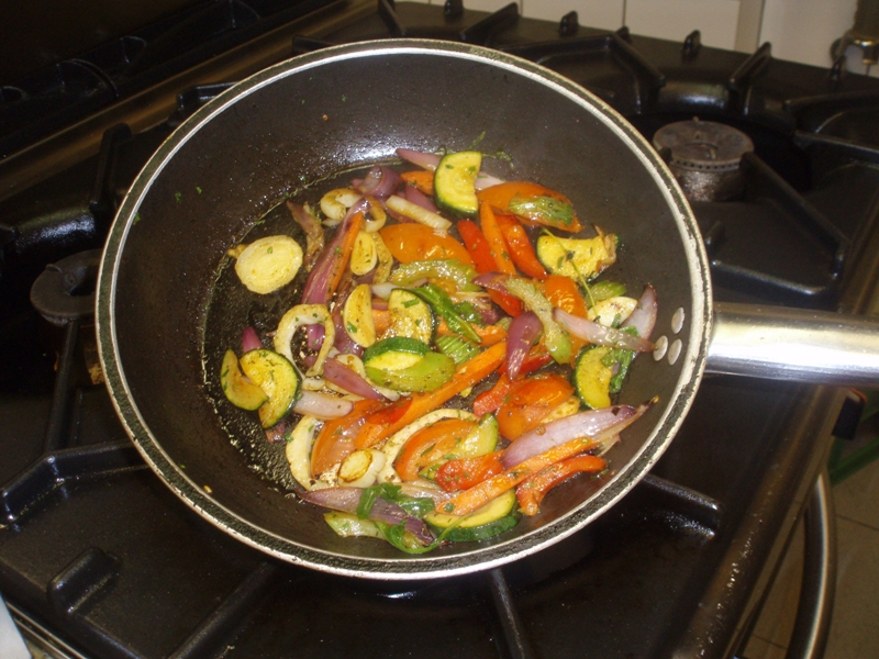 Všechnu zeleninu dobře omyjeme, brambory a cibuli oloupeme, z paprik odstraníme stopky a zrníčka. Fazolky překrojíme na polovinu, brambory a tykvičky nakrájíme na kostičky cca 2 x 2 cm, cibuli a rajčata na kolečka a papriky na nudličky.
